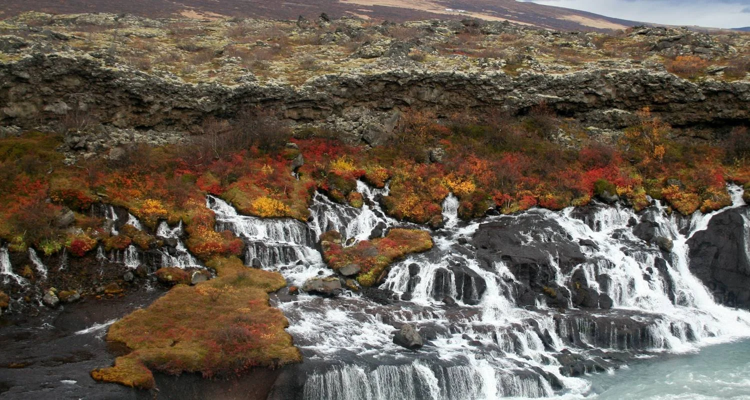 At 09:00 meet your tour guide who shows the group the highlights of Iceland’s exciting capital. Then we head west. We stop in Borgarnes and learn about Iceland’s earliest days at the Settlement Center. Next we head to Borgarfjörður, known as the Saga Valley because of its many important historical events. We get a chance to climb the Grábrók volcano crater and visit Deildartunguhver, Europe’s most powerful hot spring. Hraunfossar is a series of waterfalls pouring from beneath a wide lava field. Barnafoss – the Children’s falls, is nearby with its own tragic tale. The afternoon includes a lecture about Northern Lights. After dinner, we step into the hotel garden in search of the Northern Lights followed by a hot cup of chocolate or tea.