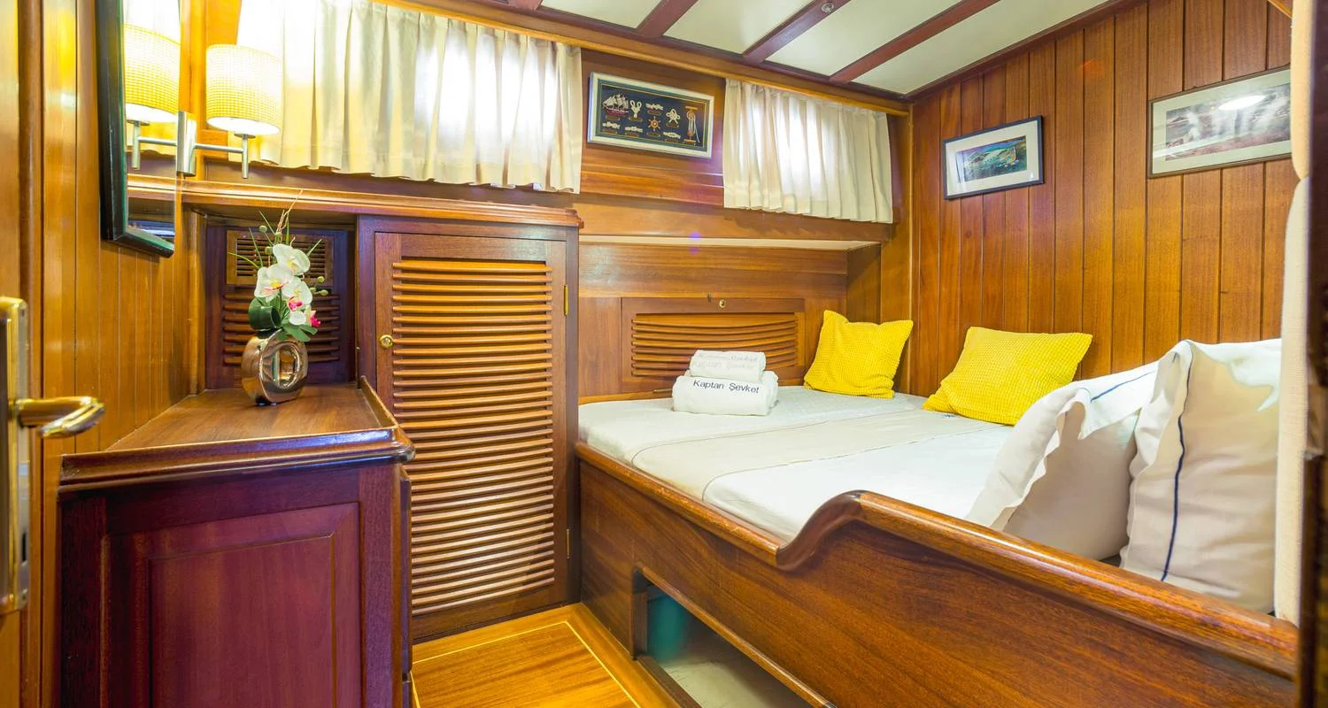 Die Kaptan Sevket ist eine elegante, handgefertigte Gulet aus Holz, die von türkischen Handwerkern in der Familientradition geschickter Kunsthandwerker hergestellt wird und klassische Handarbeit mit modernsten Bautechniken kombiniert. Sie ist eine klassisch gebaute Gulet-Yacht und ihr Design ist so angelegt, dass sie sehr nah am Meer liegt und das Meer sanft aufnimmt. In den sechs geräumigen Doppel-/Zweibettkabinen finden bis zu 12 Passagiere in stilvollem Komfort Platz. Jede Kabine ist elegant gestaltet und verfügt über eine eigene Dusche und Toilette, eine Klimaanlage und alle Annehmlichkeiten, um Sie mit glänzendem Komfort zu umgeben. Auf dem hinteren Deck lädt der hölzerne Esstisch zu eleganten Abendessen ein, während eine schicke gepolsterte Sitzecke zu bezaubernden Gesprächen einlädt.
