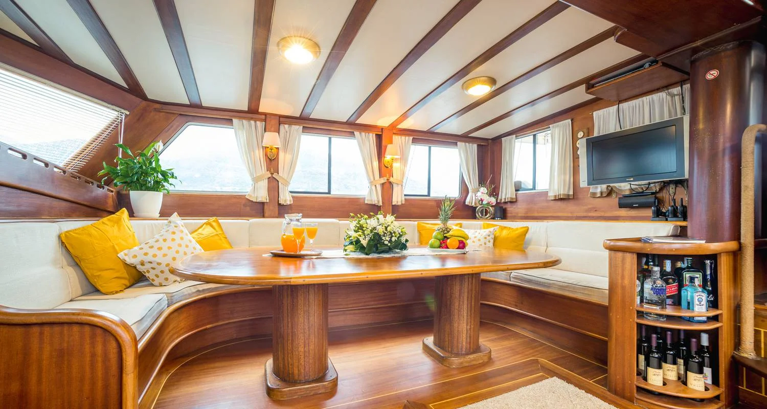 Im Hauptraum finden Sie eine voll ausgestattete Küche, einen Esstisch und gemütliche Sitzgelegenheiten sowie einen Fernseher, eine Minibibliothek und eine voll ausgestattete Bar. Auf der vorderen Terrasse befindet sich eine geflieste Liegewiese, auf der Sie auf Ihrem persönlichen Liegekissen die Sonne genießen können. Entspannen Sie sich anschließend in der plüschigen Lounge im Freien und genießen Sie einen Drink bei einem bezaubernden Sonnenuntergang. Ihr freundlicher Kapitän, der Koch, der Steward und der Deckshelfer sind jederzeit an Bord und kümmern sich um jedes noch so kleine Detail, damit Ihr Kreuzfahrterlebnis absolut perfekt wird.