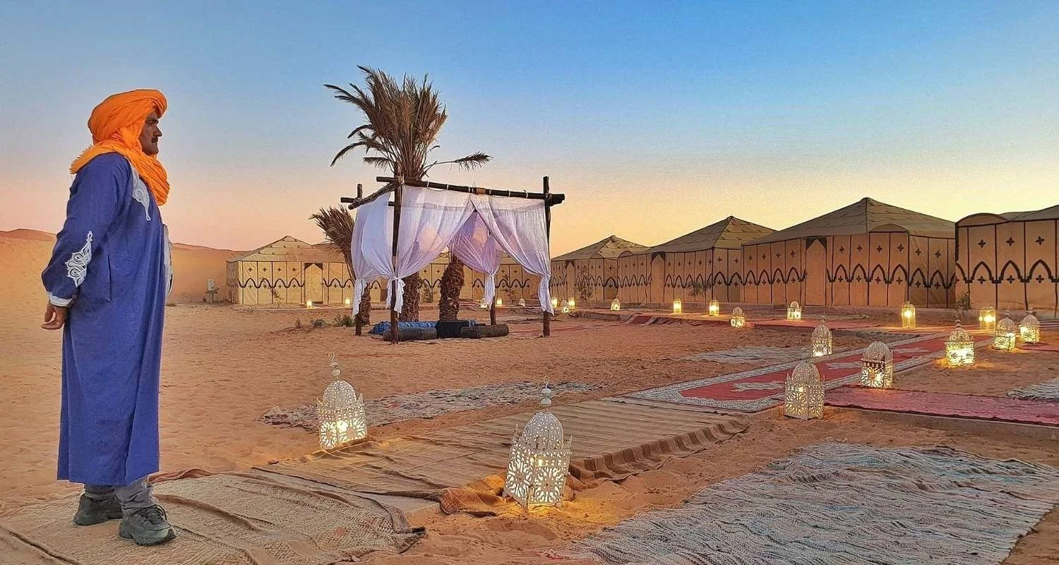 Near Merzouga, you can take a short break as you prepare for the trip to your desert camp. If you ride a camel, you will arrive at camp just before sunset. You can climb up to watch the colorful sunset reflecting on the sand dunes.