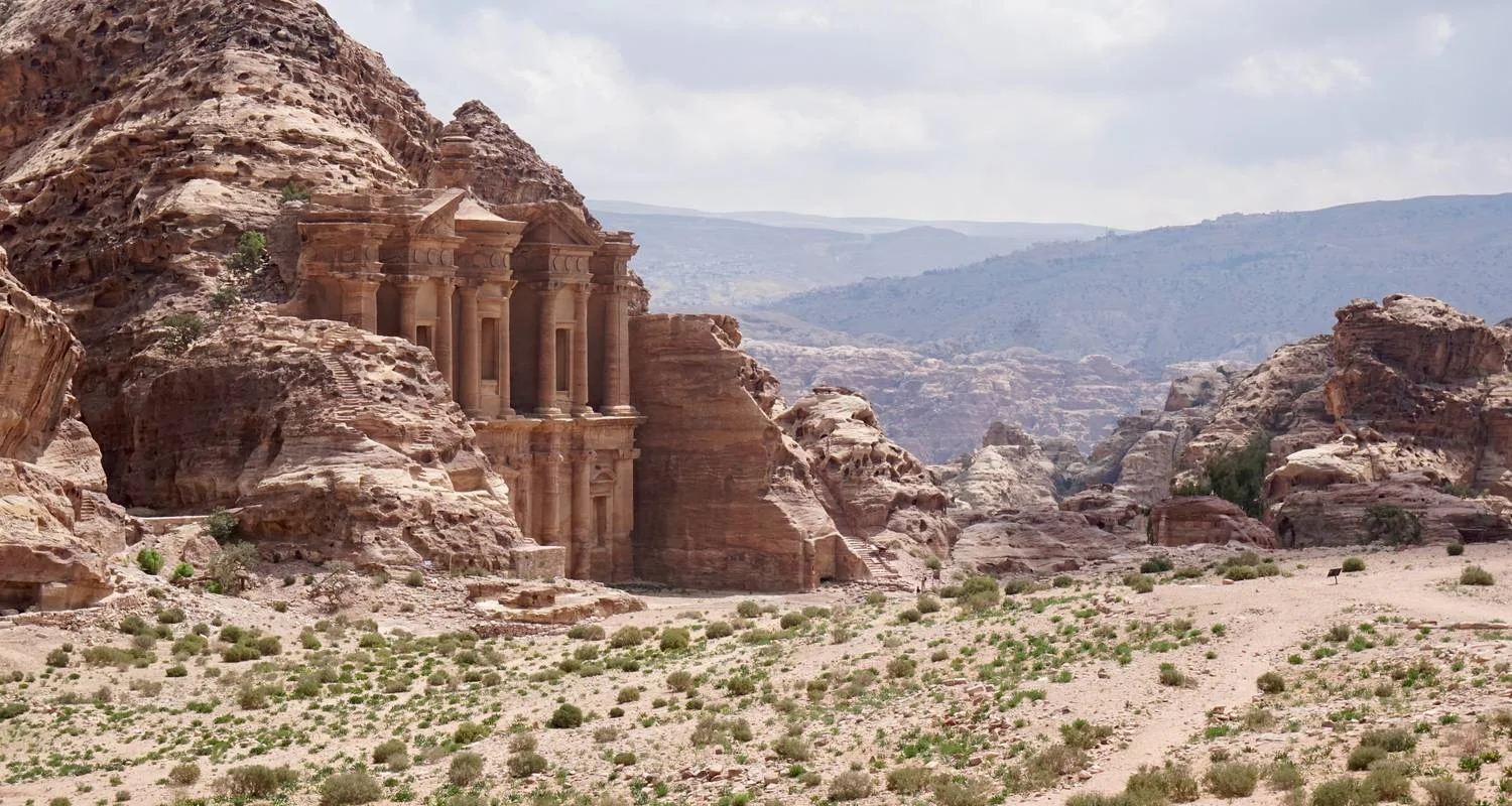Today's adventure takes you on an extraordinary, lesser-known Bedouin path that winds through the mountains and leads into Petra. The journey begins with a scenic walk across open farmland, transitioning to a trail across eroded sandstone, offering breathtaking views over the Great Rift Valley to the west. An hour later, the trail brings you down towards Petra, unveiling the awe-inspiring rock-cut façade of ad Deir, the Monastery. Here, you can take a break, enjoy some tea, and explore the ruins, before descending the Nabataean processional stone steps into the heart of Petra. After meandering through the ancient temples and tombs, you'll exit through another secret slot canyon known as 'the Dark Siq,' eventually circling back towards Petra and entering via the main siq for a classic arrival in the city. This leads you to Petra’s iconic and most celebrated monument, the Treasury. This itinerary offers a truly spectacular day of hiking around Petra, allowing you to experience both its most remarkable routes in a single day.