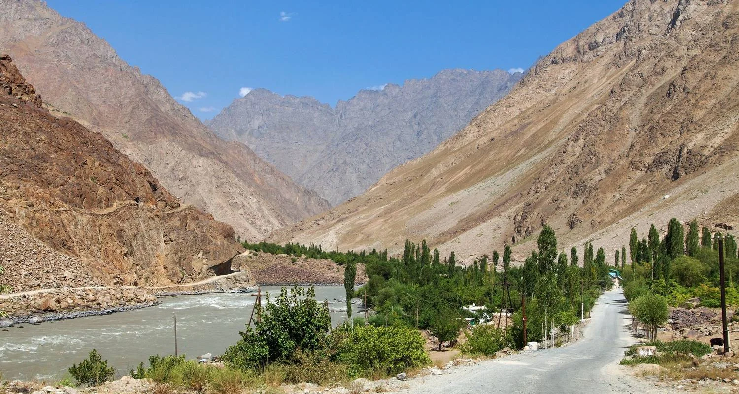 Today you begin one of the most captivating drives of the Pamir Highway, tracing the winding path of the Panj River through deep mountain gorges and breathtaking valleys. As you follow the narrow, serpentine road, Afghanistan lies just across the river, so close you can wave to children playing in riverside villages or watch herders leading their flocks along dusty trails. The landscapes here are raw and dramatic—sheer rock faces plunge into rushing waters, while ancient footbridges and lone poplar trees dot the riverbanks.