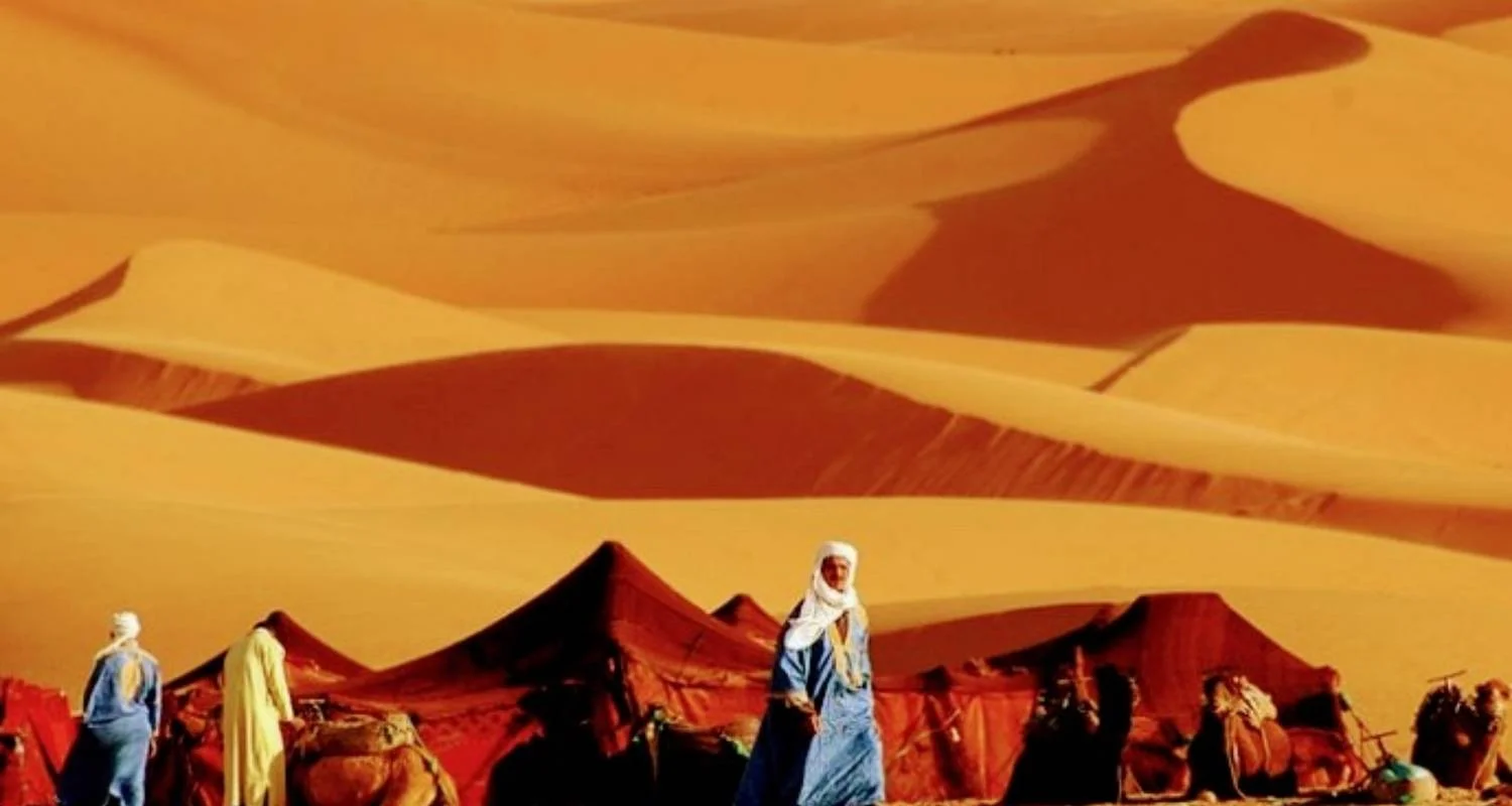 Today, we embark on a tour around the Erg Chebbi dunes, visiting the ancient mines of Mfis, the Gnawa village of Khamlia, Tisserdine, the Hassilabied Oasis, and meeting Nomadic families. Enjoy a traditional local dish for lunch. As the sun sets, experience a camel trek or a 4x4 ride to your desert camp, where you'll soak in the breathtaking views and explore the dunes. In the evening, enjoy dinner around a campfire, traditional local music, and some free time before settling in for an overnight stay in your private desert tent.