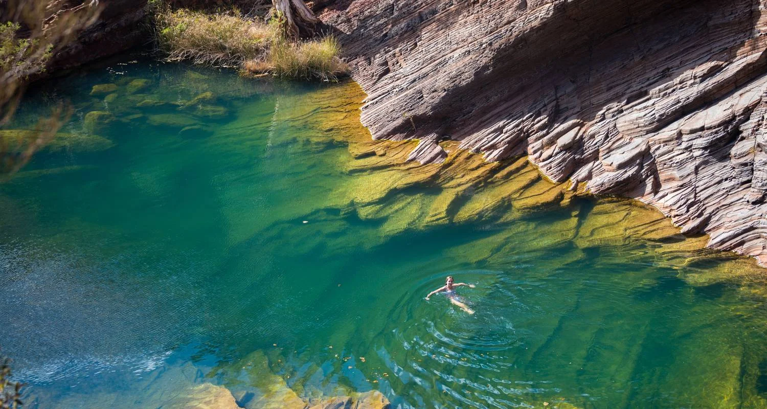 Experience a true frontier on a Karijini National Park tour, where deep gorges carve through the landscape, waterfalls cascade from rugged escarpments, and remote turquoise rock pools glisten like hidden gems. The wilderness is wilder, the colours brighter, the air clearer. Your Karijini tour weaves deep into the national park. It took billions of years to create the geological wonders you see: the red layered cliffs, the quiet gorges, the soaring gum trees, and distinctive termite mounds. It covers a staggering 630,000 hectares in the Hamersley Range, making it WA’s second-largest national park.