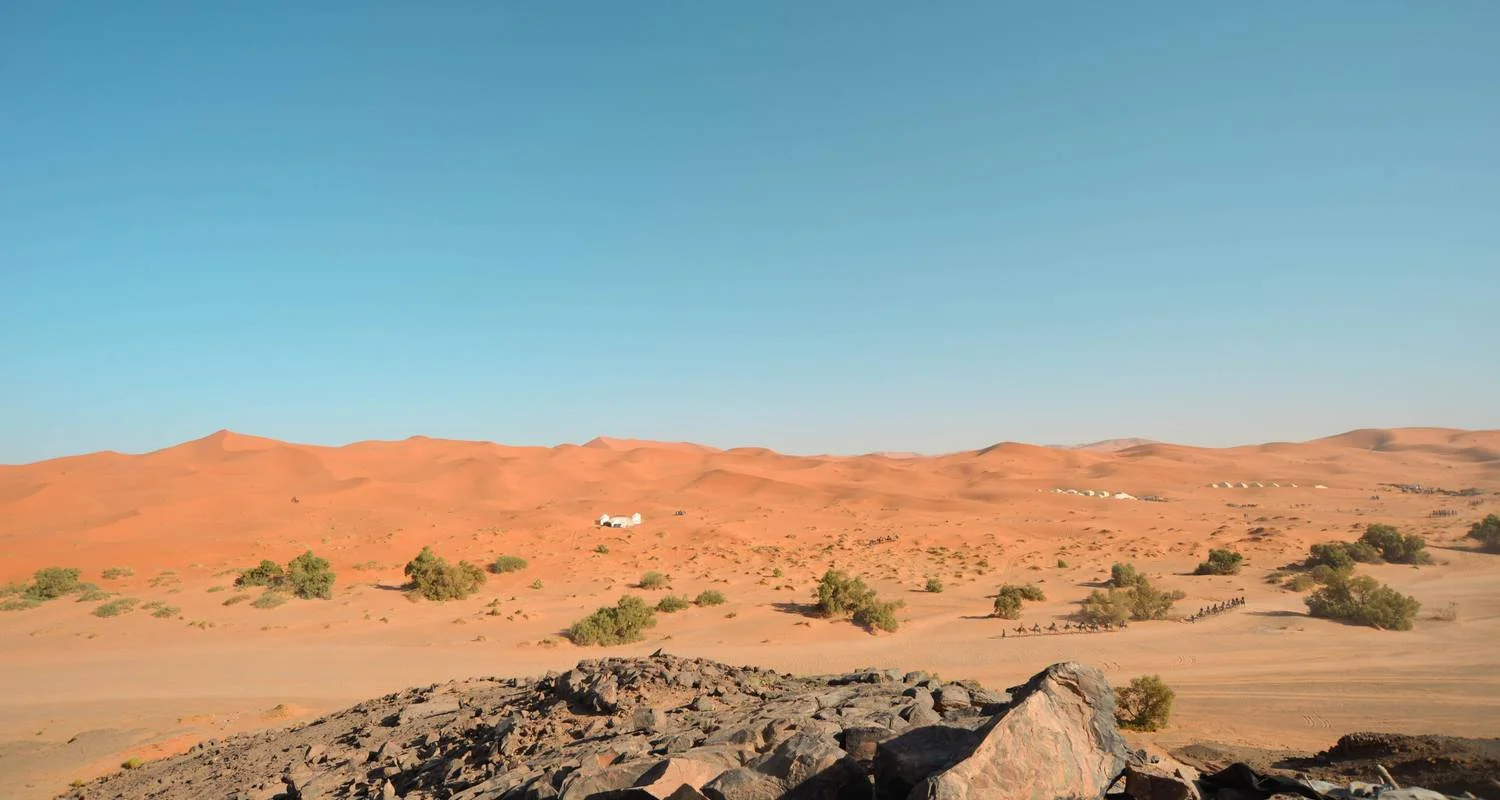 El primer día, partirás de tu hotel en Marrakech con tu propio chófer. Viajarás por las montañas del Alto Atlas, contemplando las increíbles vistas del paso de Tizi n'Tichka. Por el camino, visitarás la impresionante Kasbah de Taourirte en Ouarzazate. Continuando tu viaje, te dirigirás al valle del Draa y a la ciudad de Zagora, atravesando las montañas del Anti Atlas por el paso de Tiniffift. Antes de que se ponga el sol, llegarás al desierto de Mhamid y darás un paseo en camello para presenciar la impresionante puesta de sol sobre las dunas. Pasarás la noche en una tienda tradicional bereber en el desierto.
