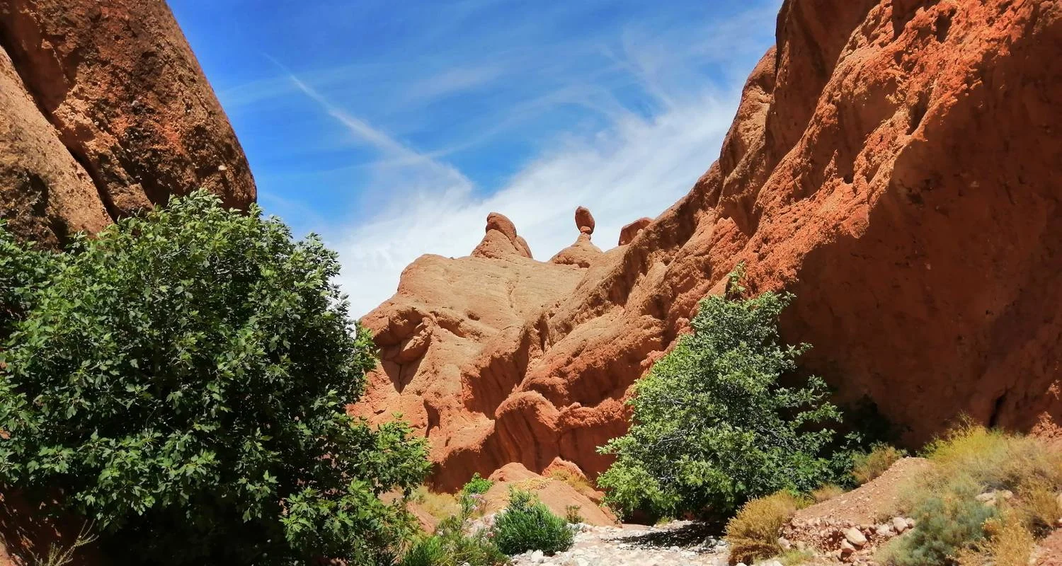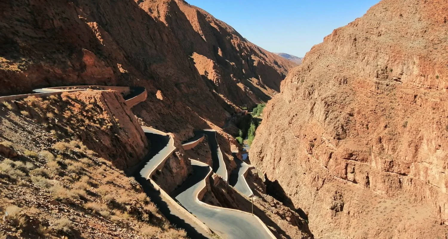 Día 1: Salida de Marrakech hacia el valle del Dades pasando por las montañas del Alto Atlas, Ait-Benhaddou y Ouarzazate: Comenzando tu viaje desde Marrakech, embárcate en un viaje panorámico a través de las pintorescas montañas del Alto Atlas. La primera parada será en la histórica Kasbah de Ait-Benhaddou, Patrimonio de la Humanidad de la UNESCO, conocida por su impresionante arquitectura y por ser un popular escenario cinematográfico de películas como Juego de Tronos, Gladiator y Lawrence de Arabia. Este antiguo bastión fortaleza servía como importante punto de parada en las antiguas rutas comerciales que conectaban el África Subsahariana con Marrakech. Tras visitar la Kasbah, continúa hacia Ouarzazate, donde puedes optar por visitar la Kasbah de Touarirt y los Estudios de Cine. Desde Ouarzazate, viaja por la carretera de las mil Kasbas para llegar al Valle del Dades, pasando por los Oasis de Skoura, la ciudad de las rosas y pueblos bereberes por el camino. Pasa la noche en las impresionantes Gargantas del Dades.