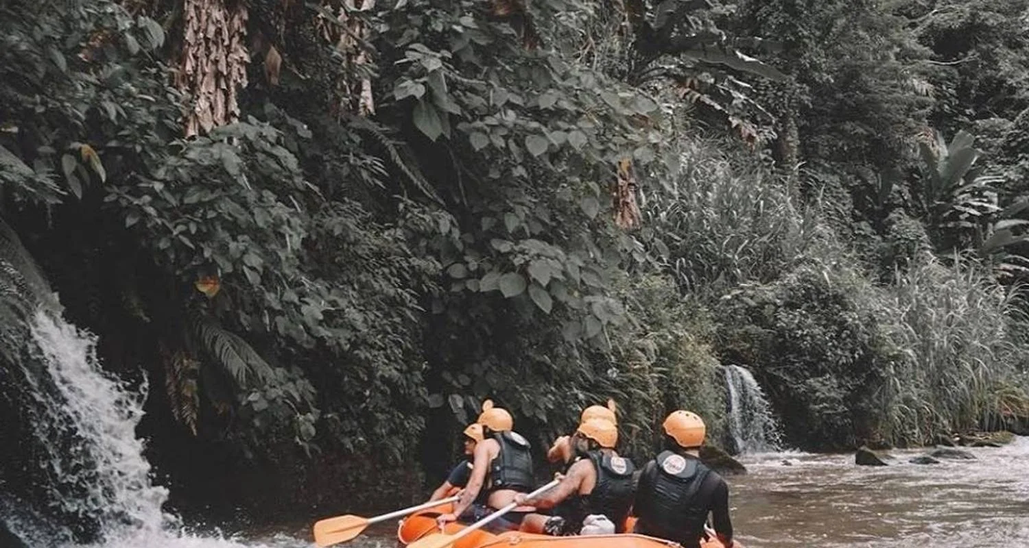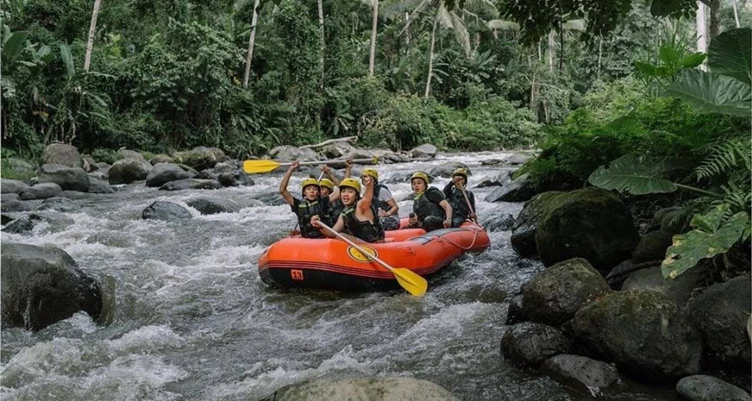 4. 14.00 Rafting en aguas bravas en el río Ayung (dos horas de viaje en balsa por el río Ayung, visualmente espectacular, que se hace aún más agradable por la sensación de seguridad Esta aventura para huéspedes de todas las edades es una mezcla de emoción salvaje, vistas que cortan la respiración y visitas turísticas bien guiadas e informativas).