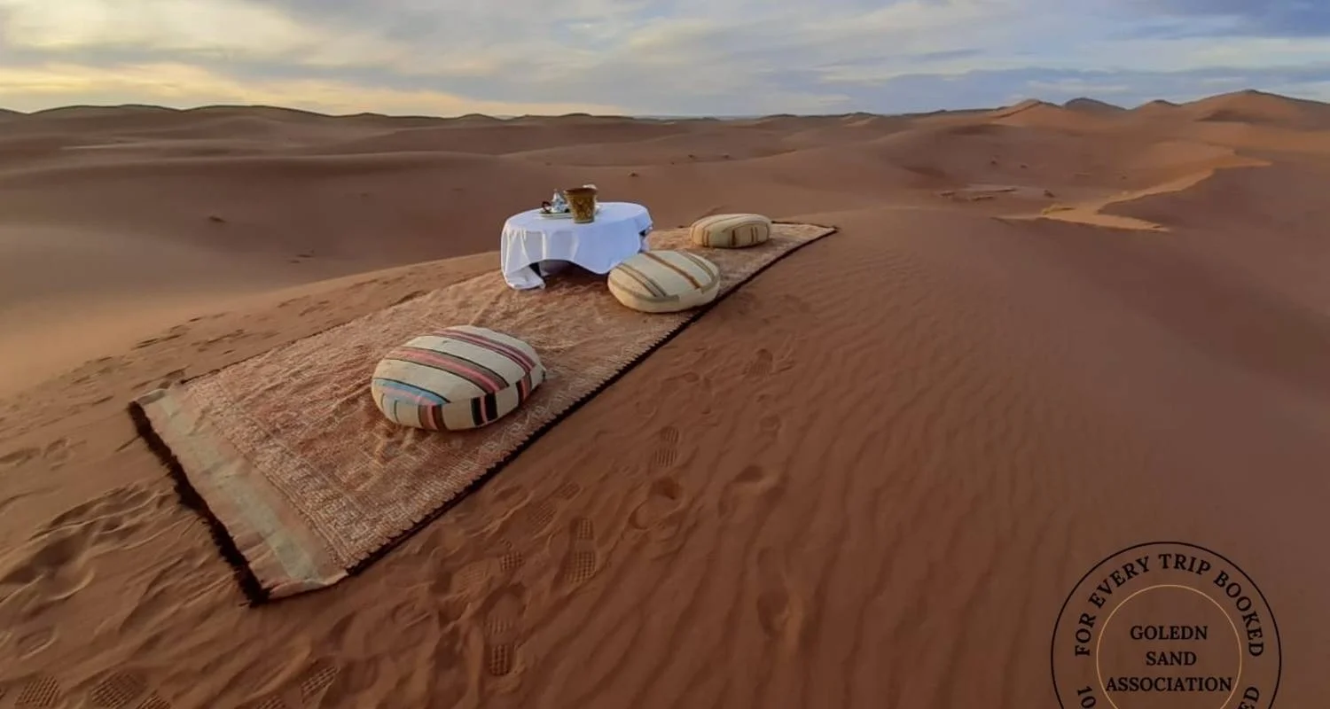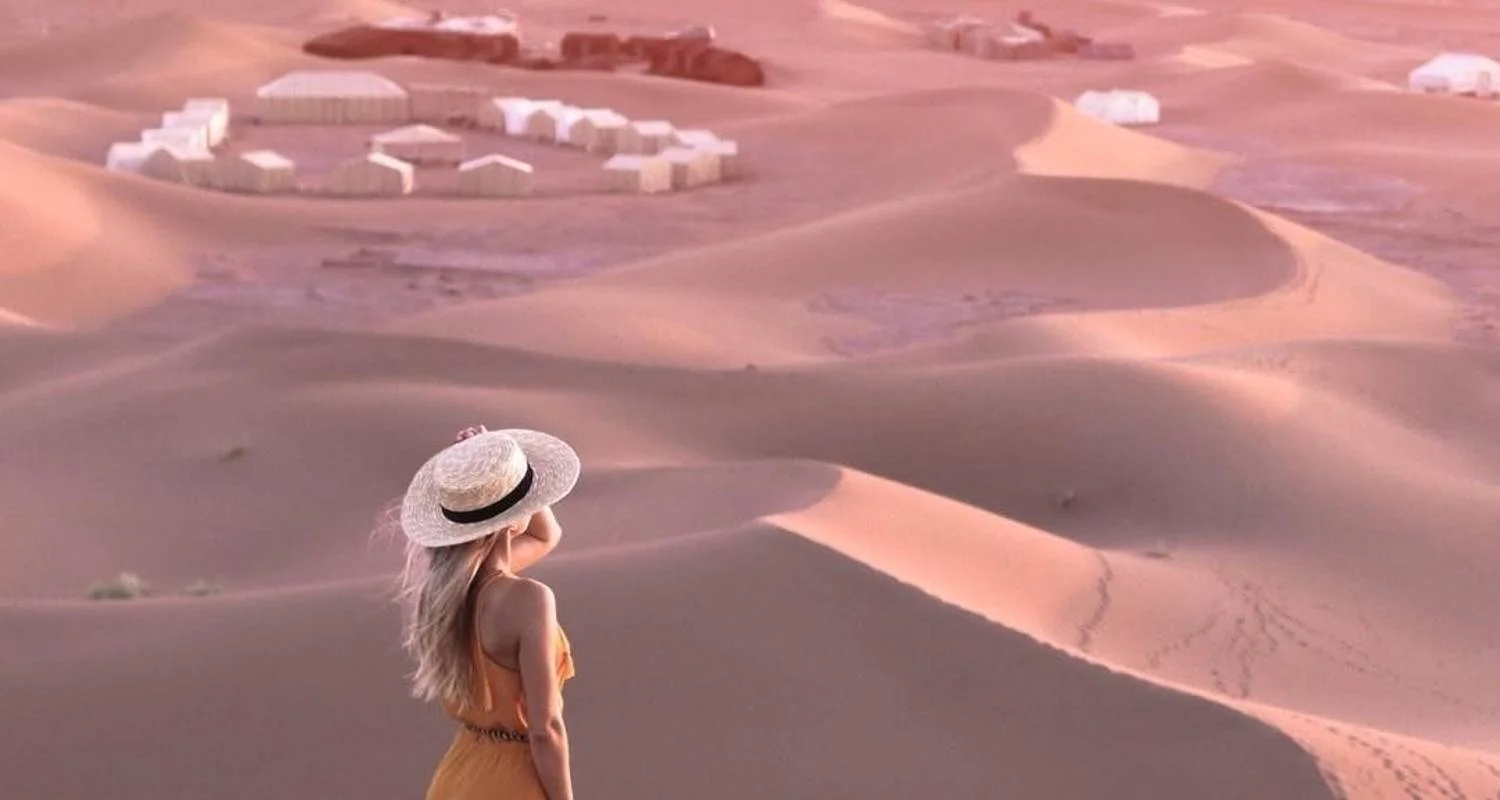 De Marrakech a Merzouga Safari de 3 días por el desierto en 4*4 En el sur de Marruecos De Marrakech al desierto de Merzouga atravesando hermosos paisajes de Skoura, las Gargantas del Dades y el Valle del Draa hasta la arena dorada de Merzouga, donde pasarás una noche encantadora en nuestro campamento de LUJO con experiencia de paseo en camello y puesta de sol.