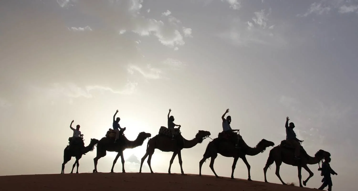 Llega a las espectaculares dunas de Erg Chebbi (Merzouga). Al borde del desierto, prepárate para una excursión en dromedario (aproximadamente 1,5 horas) por las arenas doradas, haciendo una pausa para disfrutar de la mágica puesta de sol sobre las dunas. Luego continuarás en camello hasta tu campamento en el desierto, donde pasarás la noche en una tienda nómada tradicional (vivac) bajo las estrellas.