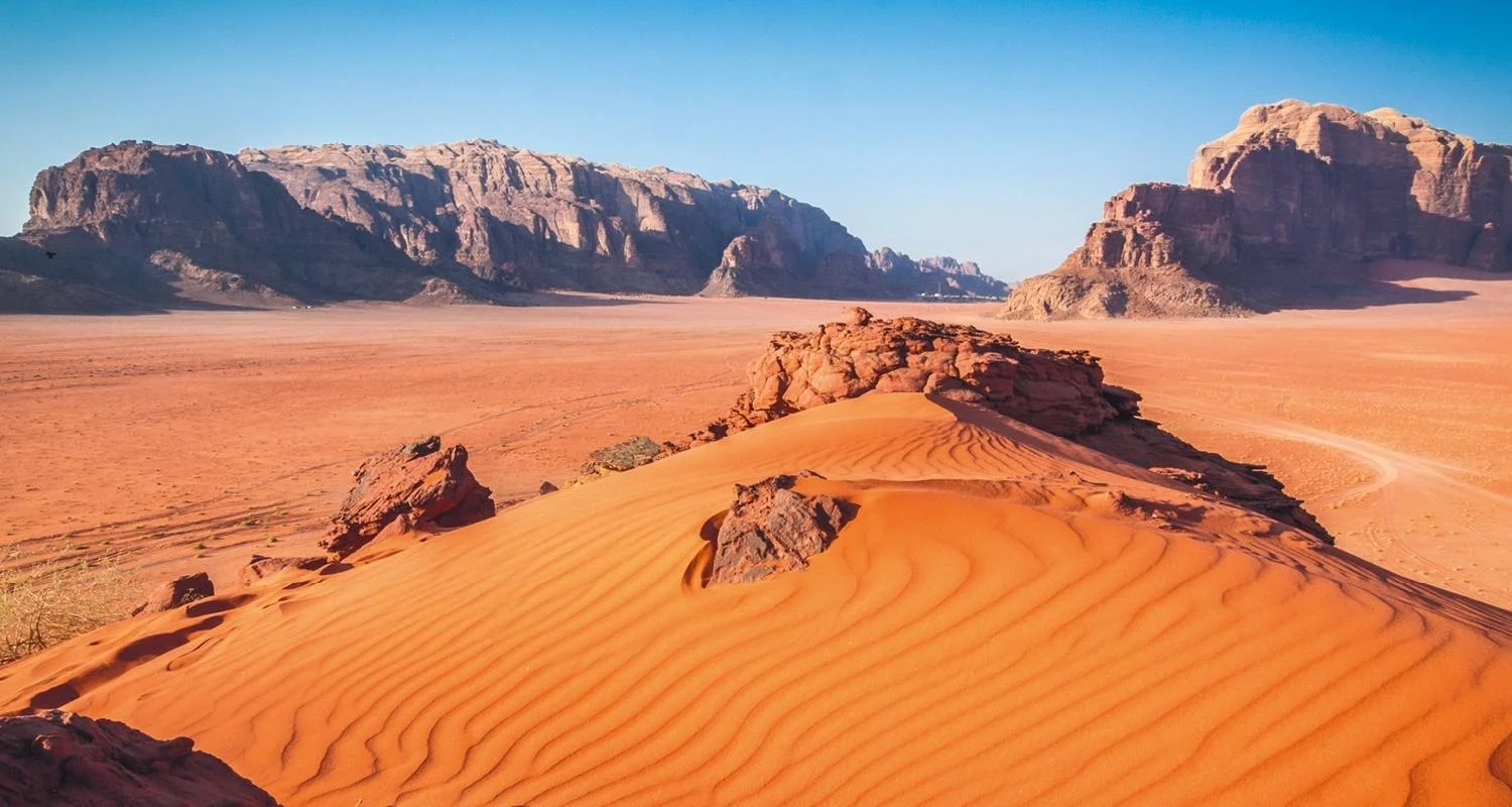 Travel in the footsteps of Lawrence of Arabia as you discover the dramatic desert landscapes of Wadi Rum, also known as the Valley of the Moon. This majestic area offers vast red sands and towering rock formations that have captivated travellers for centuries.