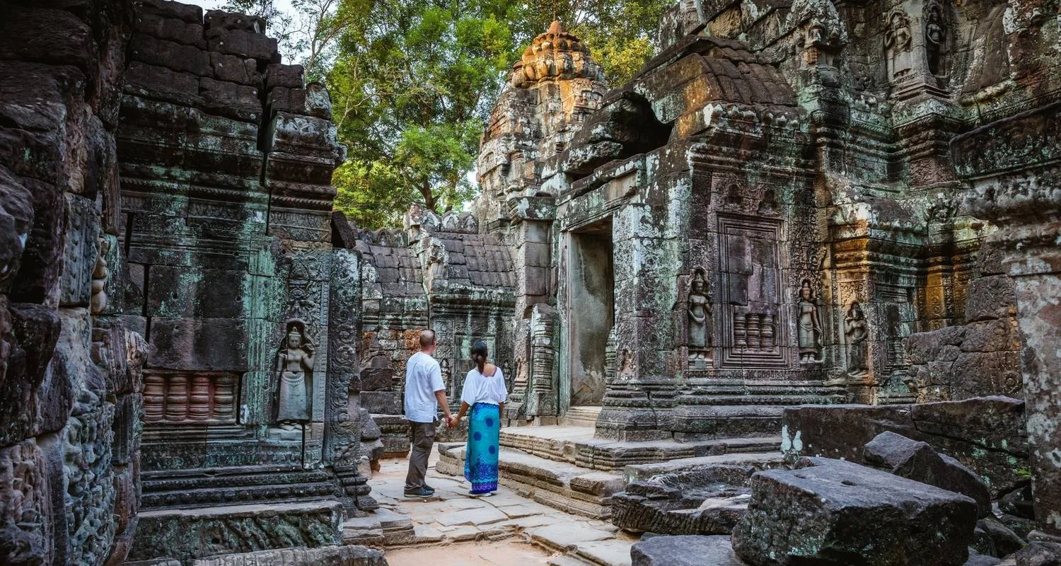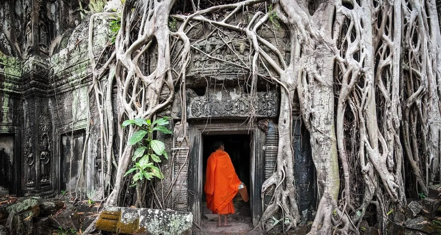 Tôt le matin, nous commençons par visiter Ta Prohm, qui a presque disparu dans la jungle, et qui constitue une scène étrangement obsédante et exotique. Nous continuerons par la visite d'Angkor Wat, l'une des ruines les plus impressionnantes au monde. Ensuite, nous explorerons la mystérieuse cité royale d'Angkor Thom et le Bayon, ainsi que les environs du complexe, tels que le Baphou, les terrasses des éléphants, la terrasse du roi lépreux et le palais royal. Enfin, nous visiterons le temple de Preah Khan avant le transfert à l'aéroport de Siem Reap pour le départ.