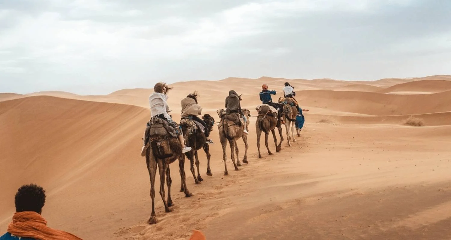 Départ matinal de votre hébergement et voyage à travers les magnifiques montagnes du Moyen Atlas, avec comme première étape Ifrane, souvent surnommée "la petite Suisse" en raison de son architecture alpine unique et de son climat frais. Promenez-vous dans ses rues immaculées et imprégnez-vous de son atmosphère tranquille. Nous poursuivons notre voyage et traversons les paysages pittoresques du Moyen Atlas, en passant par des forêts de cèdres et des vallées pittoresques. Gardez un œil sur les macaques de Barbarie qui habitent la région. À l'approche du magnifique désert de Merzouga, le paysage se transforme en dunes ondulantes qui semblent s'étendre jusqu'à l'horizon. En arrivant à Merzouga, vous serez captivé par la beauté dorée du désert. Embarquez pour une randonnée chamelière de deux heures au cœur des dunes, alors que le soleil se couche et peint le ciel de teintes vibrantes. En arrivant à notre luxueux camp dans le désert, vous serez accueilli avec une hospitalité chaleureuse, vous dégusterez un dîner marocain traditionnel et vous vivrez la magie de la nuit dans le désert, remplie de ciels étoilés et de musique berbère.