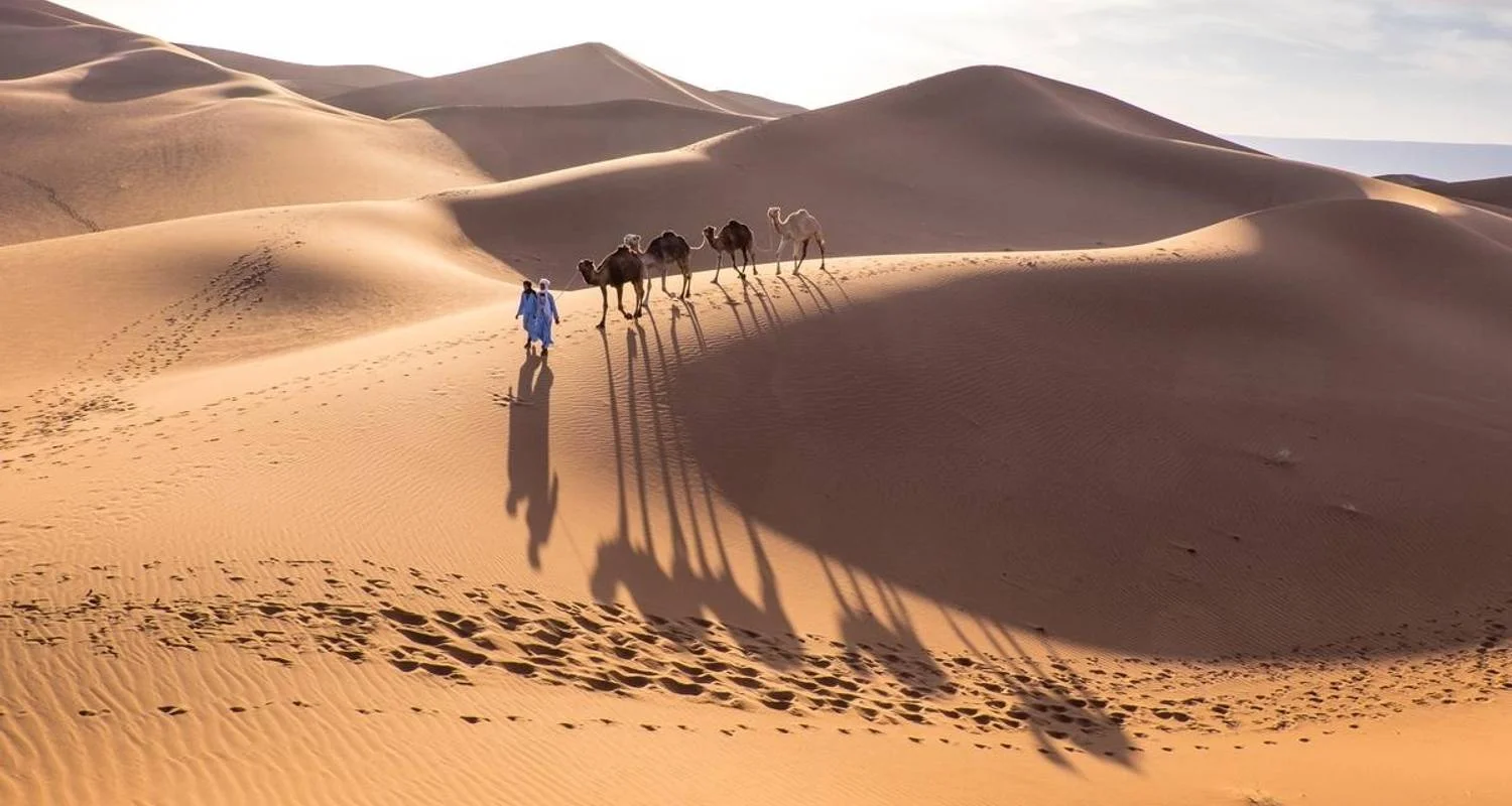 Départ aujourd'hui pour un trajet à travers les montagnes du Moyen Atlas jusqu'au bord du Sahara. Installez-vous dans votre hôtel au bord des dunes et profitez d'un accueil chaleureux avec un thé à la menthe. En fin d'après-midi, faites une promenade à dos de chameau dans les dunes pour admirer le coucher du soleil. Apprenez à nouer un turban pour vous protéger du soleil du désert et donner un peu d'éclat à vos photos. Ce soir, savourez un dîner traditionnel, puis rassemblez-vous autour d'un feu de camp sous les étoiles, près de votre hôtel. Écoutez des histoires sur la vie dans cette région et, peut-être, de la musique traditionnelle sur les tambours.