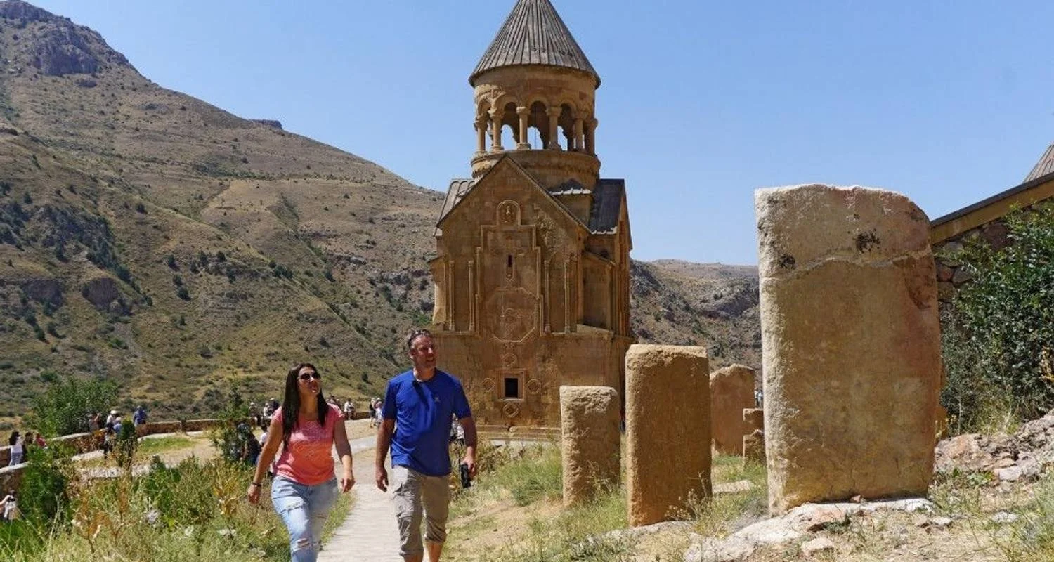 You explore the Ararat plain, where Noah is said to have planted the first grapevine. Drive to the Chor Virap monastery, where Ararat seems close enough to touch. Visit the Noravank Monastery, located at the end of the beautiful Amaghu Gorge, which impresses with its special exterior reliefs and reddish façade. Enjoy a tasty lunch in a special restaurant, where you will once again be able to sample the great Armenian cuisine. Continue to Yeghegnadzor. Overnight stay in a guest house. (Driving time approx. 2-3h, walking time approx. 1-2h, 300 m↑, 400 m↓, 6 km).