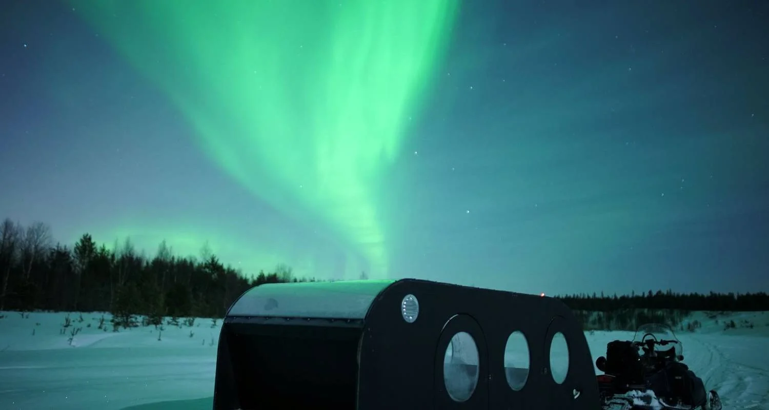 oPirée des aurores boréales en caravane-traîneau chauffée