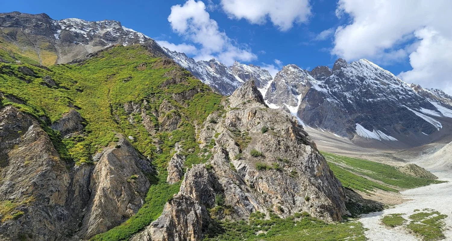 Le pic Masherbrum (7821 m) est une montagne de forme unique dont la pointe enneigée suscite trépidation et admiration. Au-delà du village de Hushe, la présence du Masherbrum fait de l'ombre et le trek mène aux pâturages d'été des villageois de Hushe. Cette randonnée courte et facile au cœur du Karakoram est recommandée aux aventuriers de tous niveaux et de tous âges. La seule marche sur le glacier est une section de 30 minutes avant le camp de base.