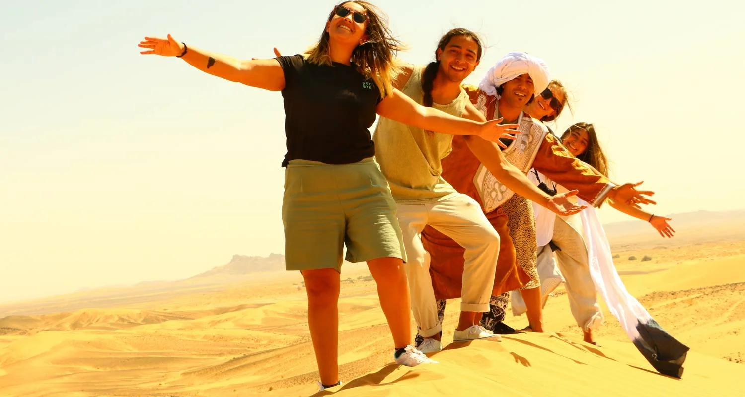 Early morning pick up in your Riad/Hotel in Ouarzazate. We start our drive along the road of the Kasbahs to the Rose Valley, Boumalne-Dades and the Todra Gorges. The river Todra has formed these enormous and impressive stone walls over thousands of years. This is a great opportunity to take photos and go for a short walk in the gorges. After lunch along the way it is time for the desert! Upon arrival in Merzouga, you have time to rest a bit in the lodge where you can put your luggage. Meet your camel driver and head to the desert on top of your friendly camel. After arriving at the Sahara Desert Camp, you can climb the high dunes and enjoy the incredible views while the sun sinks below the horizon. Settle in your private tent and drink some mint tea before the traditional dinner is served. You can spend the night watching for shooting stars or dance around the camp fire to the beat of the desert drums.