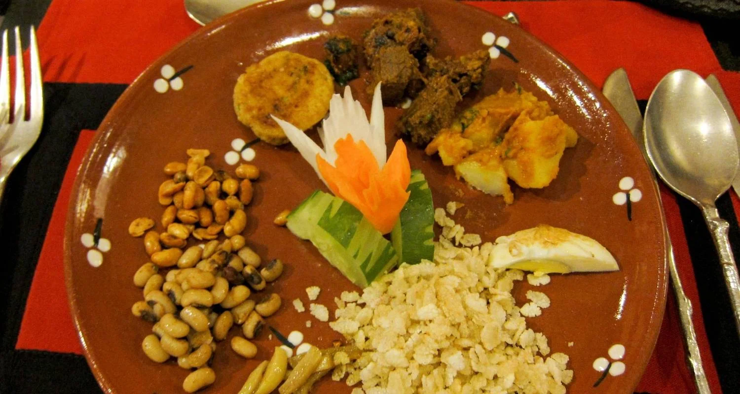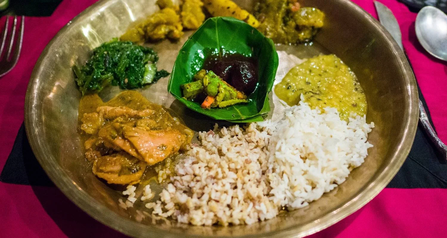 As for the sumptuous dinner at Krishnarpan Restaurant is a six-course culinary journey that showcases the essence of Nepalese cuisine. The menu includes traditional dishes such as 'Samaya Bajee,' an assorted starter served during religious ceremonies, 'Chyau Ko Sekuwa,' roasted creamed mushrooms, 'Veg. Momo,' traditional Nepali-style minced vegetable dumplings, and 'Tarkari Ko Jhol,' a Nepali vegetable soup with aromatic Nepalese spices.