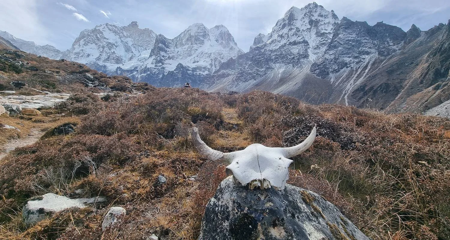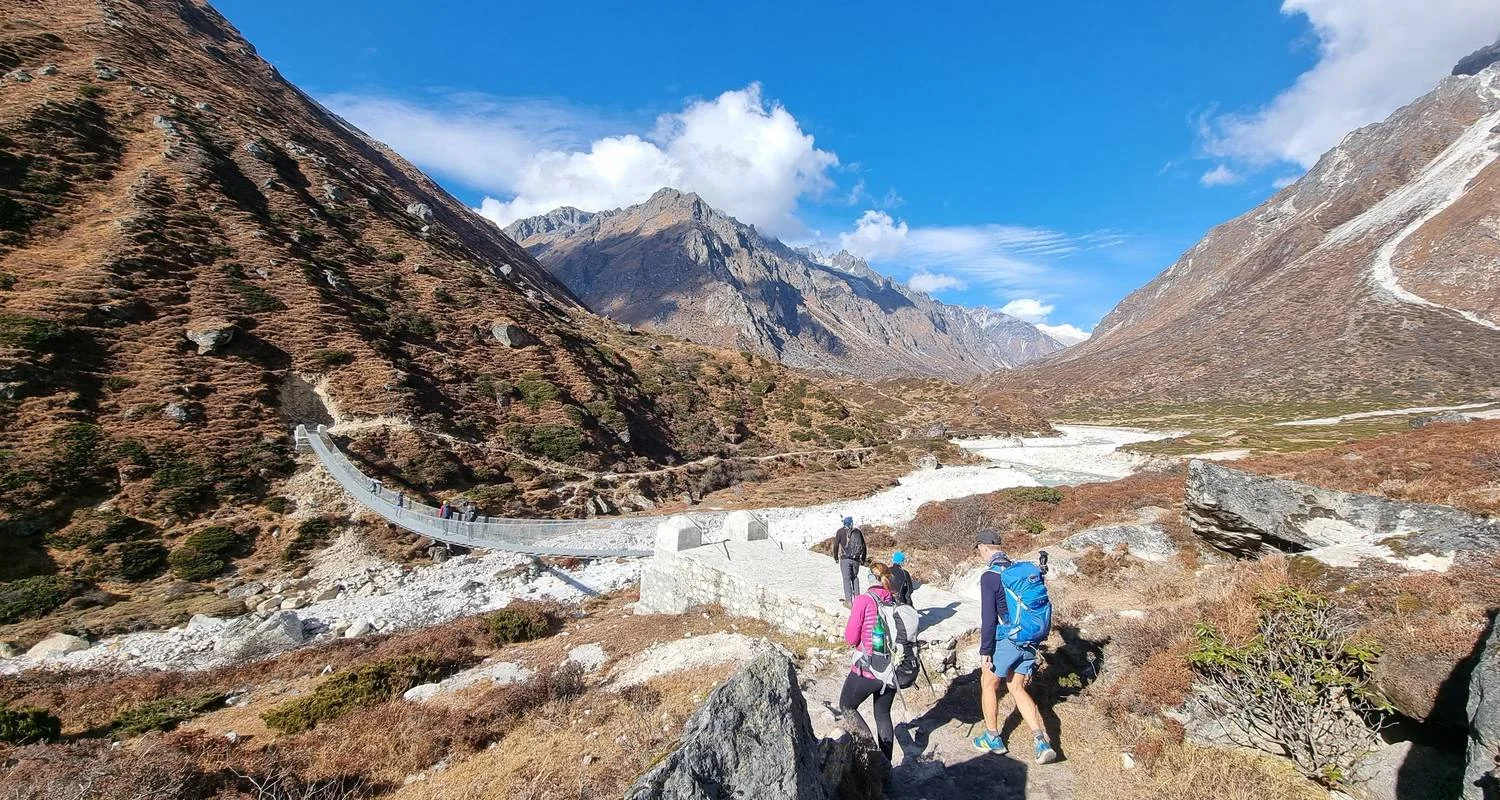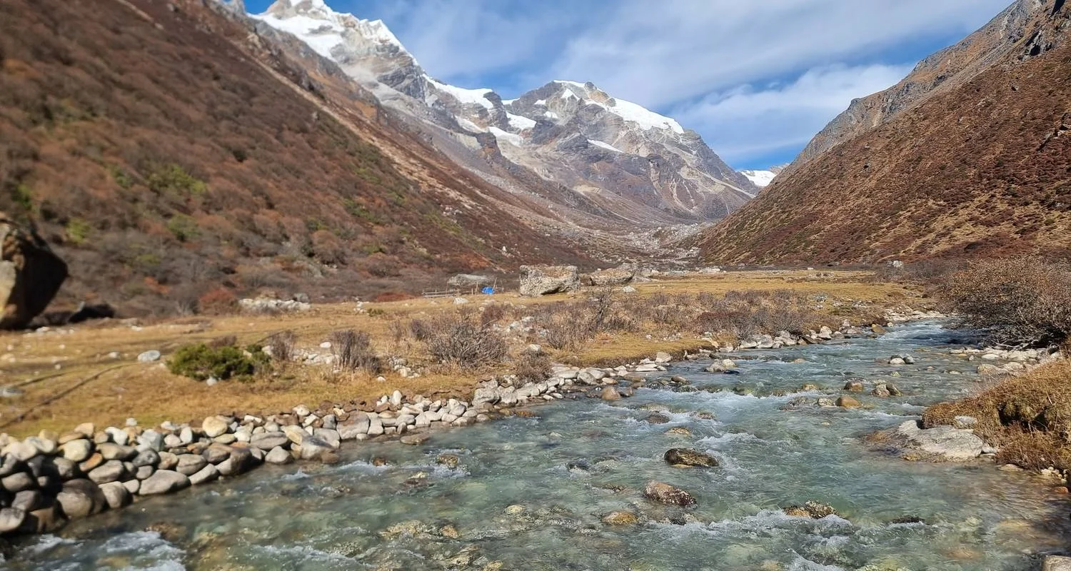 Advancing along the Kanchenjunga glacier trail, we encounter fellow trekkers during the main trekking season, both heading towards and returning from Kanchenjunga North Base Camp. Passing through Ramdang, we chance upon the Ramdang Monastery. The trail becomes challenging as we reach the junction of the Lhonak and Kanchenjunga glaciers. Continuing our journey, we arrive at the modest settlement of Lhonak, adorned with a few teahouses.